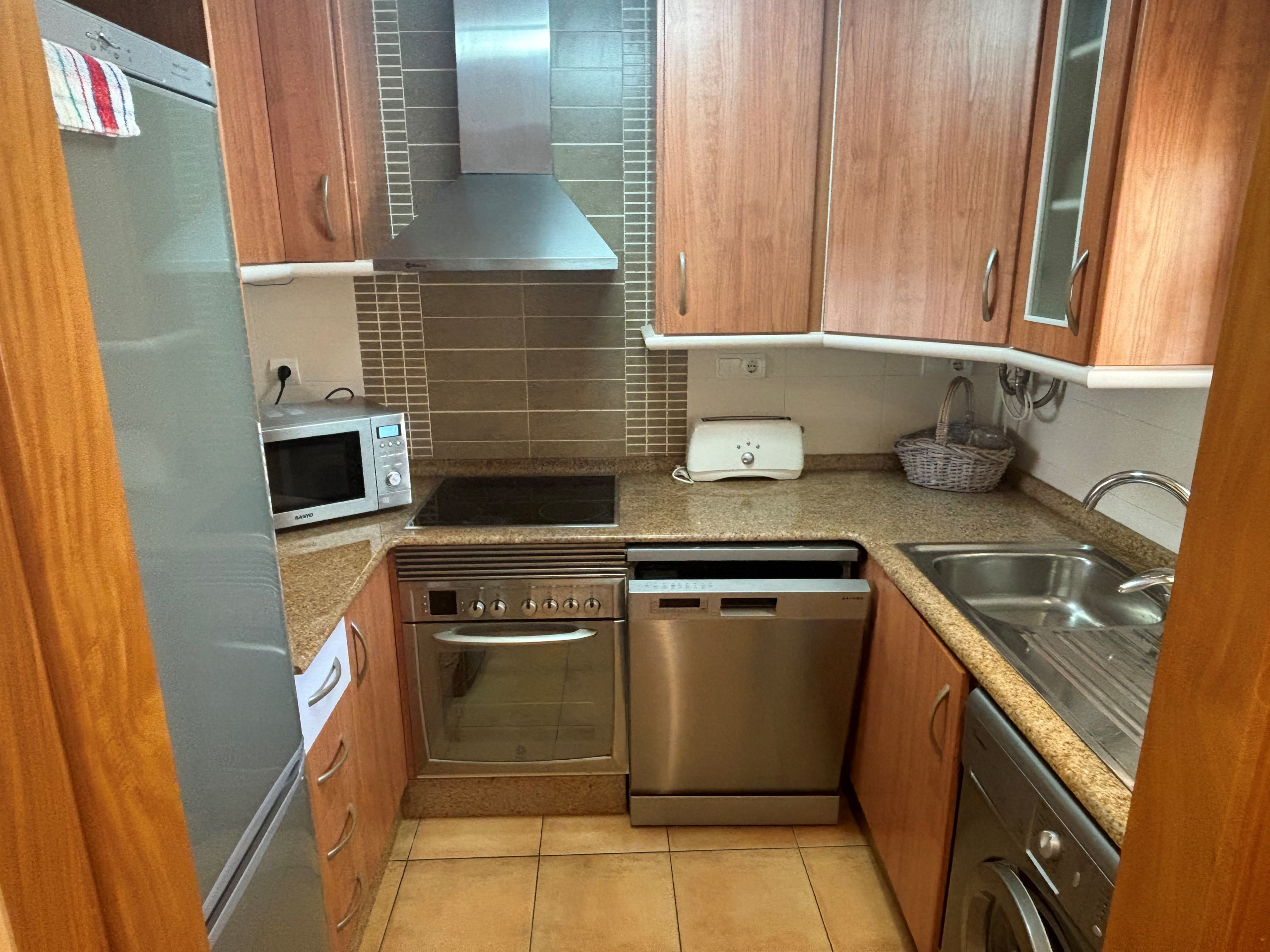 La cocina independiente, de vitrocerámica, está equipada con nevera, microondas, horno, congelador y lavavajillas.